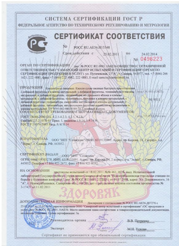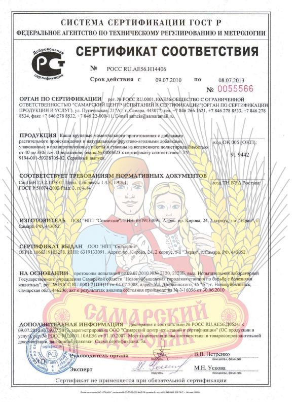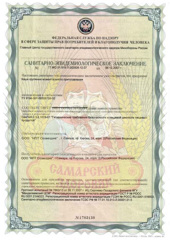 СертификатыСертифицирование продуктов "Самарский здоровяк"."НПТ "Созвездие"" производит функциональные продукты питания под товарным знаком "Самарский Здоровяк" ( патент РФ № 408834 от 18.05.10 ). Сегодня это единственный в России функционально-макробиотический продукт питания, ФПП "Самарский Здоровяк" обладает с позиции доказательной медицины (класс I, "А" высокая достоверность) лечебно-профилактическим, восстановительным и оздоравливающим эффектом (заключение о проведенных клинических испытаниях в 2009 году в Москве Отчет Федерального государственного учреждения "Российский научный центр восстановительной медицины и курортологии" Минздравсоцразвития РФ от 22.03.2010 г.). | |